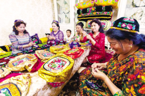 新疆哈密傳統(tǒng)刺繡品牌“密繡”繡娘展示刺繡技藝。 資料圖片