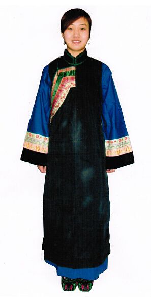 科爾沁蒙古袍款式較合身,長袍下擺窄且開衩。格外注重刺繡裝飾、穿偏開襟長坎肩、工藝精湛的尖頭靴和已婚婦女發(fā)髻式珊瑚頭飾等是科爾沁服飾最顯著的特征。