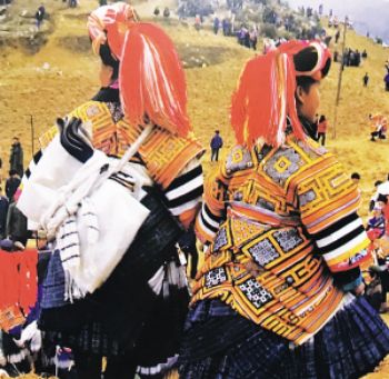 要論“疊穿”的數(shù)量之最,則當(dāng)屬貴州大方縣顯母村的苗族女性了。與苗族慣用銀飾的固有印象不同,這里的苗族女性鮮以銀為飾,她們用數(shù)量極為可觀的服飾“疊穿”來(lái)彰顯富裕。節(jié)日里,顯母村的苗族女性換上盛裝——數(shù)條百褶裙系在腰間,塑造出豐腴的臀部造型,內(nèi)層裙子素凈無(wú)花,外層裙子則布滿條帶狀蠟染裝飾。在這個(gè)難得的大型社交場(chǎng)合,未婚女孩通過(guò)“疊穿”后的獨(dú)特造型來(lái)展示自己的魅力,衣物的數(shù)量和精致程度成為了吸引異性、獲得肯定的重要標(biāo)準(zhǔn)和獲得美好婚姻的重要條件。到了婚禮時(shí),女性所著裙子的數(shù)量更是可達(dá)35條?;楹?,她們要在裙邊加上一圈深色邊飾以作標(biāo)識(shí)。