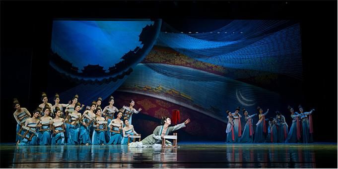 該劇在情感敘事和舞蹈語言上,采用“意中生象”“象中達(dá)意”的方式,從細(xì)微處融入唐代各地域各民族文化元素,凝練舞劇藝術(shù)品質(zhì):如取李白“醉入胡姬酒肆中”詩意演繹《胡姬舞》;取唐代畫家周昉《簪花仕女圖》畫意演繹《簪花舞》;取唐代畫家張萱《搗練圖》筆意演繹《搗練舞》;取王維“大漠孤煙直,長河落日圓”詩意生發(fā)《西涼武舞》等。在劇情發(fā)展和戲劇沖突中,設(shè)計符合人物性格的“獨(dú)、雙、三”主題舞段:凸顯西域風(fēng)情的《胡旋舞》、表現(xiàn)曲江踏春的《采桑舞》和展示教坊舞技的《白纻舞》等情景舞段,展現(xiàn)了鮮明的民族文化交融特征,實現(xiàn)了中國傳統(tǒng)文化跨越時空的當(dāng)代表達(dá)。