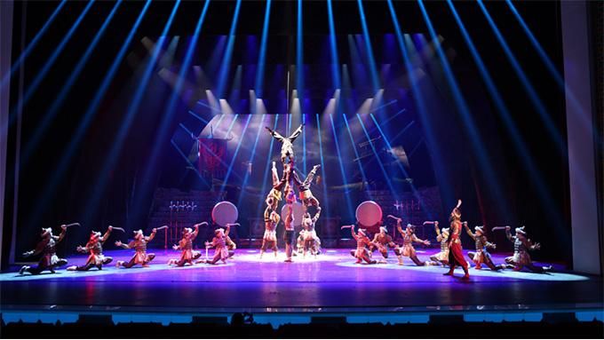 雜技是這部劇的一大亮點(diǎn)。新疆生產(chǎn)建設(shè)兵團(tuán)雜技團(tuán)近年來編創(chuàng)了《天鵝湖—男子倒立技巧》《向太陽—繩技》《春之韻—女子造型》等多個(gè)精品節(jié)目,并在國內(nèi)外重大雜技賽場(chǎng)多次獲獎(jiǎng)?!稑翘m尋夢(mèng)》中,主創(chuàng)團(tuán)隊(duì)將這些獲獎(jiǎng)節(jié)目進(jìn)行拆解,將蹬鼓、獨(dú)輪車、吊環(huán)、肩上芭蕾、水流星及舞中幡等雜技技巧與戲劇元素相融合,讓觀眾猶如置身于黃沙漫漫的絲路古國。