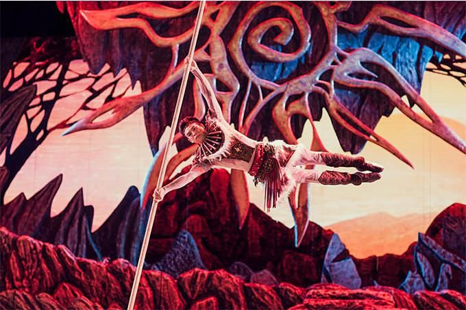 雜技藝術(shù)在劇場空間維度的呈現(xiàn),一是把身體作為一種最為本質(zhì)的符號材料進行直接表現(xiàn);二是通過與物體、音樂、舞蹈、燈光、唱詩等的排列組合,展示技藝的身體與物體、空間的關(guān)系,達到彰顯其生命意蘊與美學(xué)品質(zhì)的目的。劇中網(wǎng)吊、綢吊、轉(zhuǎn)動桿上技巧等項目非常炫技,展現(xiàn)了現(xiàn)代雜技的審美意境,詩與思在舞臺上相得益彰。綢吊極具浪漫色彩,承載著輪回與終極的生命哲理;智者的“唱詩”,凸顯了該劇的史詩特征,增加地域文化和遠(yuǎn)古歷史的厚重感。