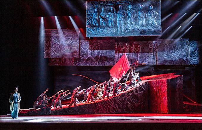 在舞蹈語言的設計上,編導融入當代元素,使觀眾不但感受到審美的親切與現(xiàn)代感,而且還自然地進入回望歷史的情境,對其思想內(nèi)涵的理解更為準確。該劇的道具使用和調(diào)度也頗為大氣,令人印象深刻。一組斜坡狀的大型舞臺道具不但由群眾演員直接移動而實現(xiàn)即時的場景調(diào)度,還可使演員上下和左右而行,最終組合成巨大的中國共產(chǎn)黨黨徽,輔助完成了人民英靈和英雄的形象塑造。