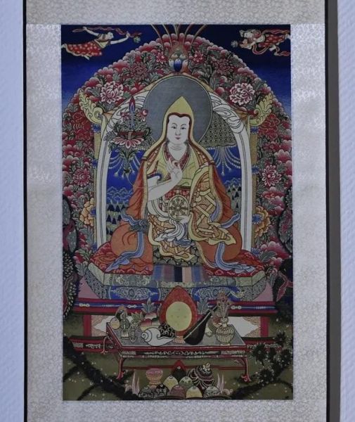 本作品的主體是藏傳佛教格魯派創(chuàng)始人宗喀巴。豐富的層次,飽滿(mǎn)的花紋,使其成為獨(dú)具風(fēng)格的高檔全真絲宋錦唐卡。