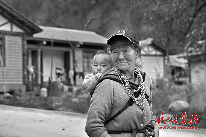 在自家的新房前喜笑顏開的獨(dú)龍族紋面婦女