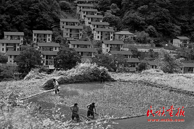 在依山而建安居房群落前獨(dú)龍族村民在翻挖、平整水田