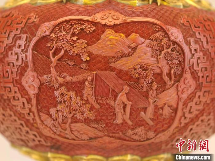 本次展出的乾隆款剔紅開光山水人物紋龍耳瓶為乾隆年間制作,是漆器與金屬工藝相結合的產(chǎn)物。乾隆時期,國力昌盛,加之乾隆帝本人的喜好和干預,造辦處使用“牙作”匠人承擔漆器雕刻,因而器物畫面帶有雕工精致、層次豐富、轉角凌厲的鋒棱之美,且紋飾寓意吉祥美好,還常常與描金、鑲嵌等工藝相結合。
