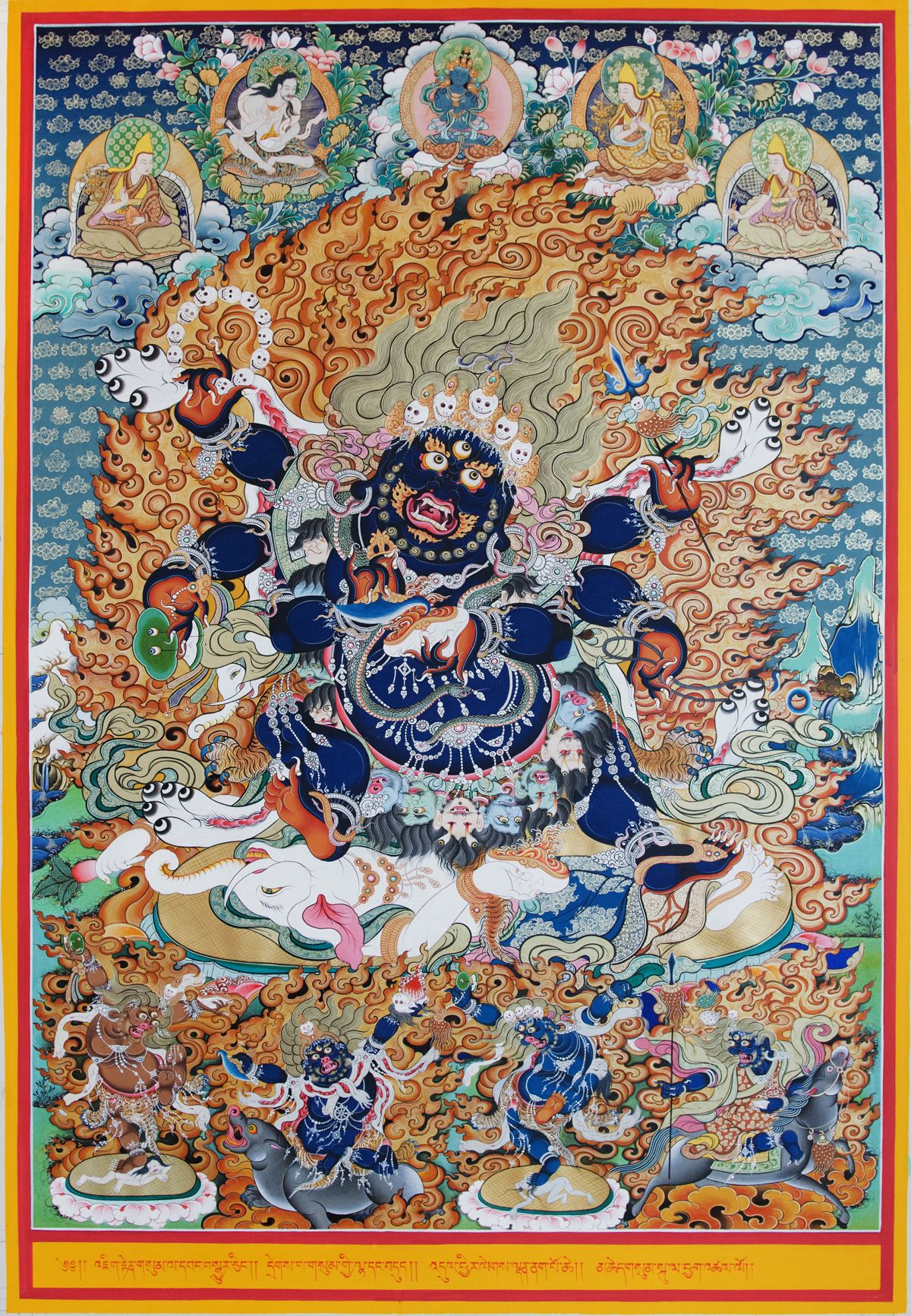 他面容猙獰恐怖,獠牙外露,三目圓睜怒視。頭發(fā)向上直立,眉間點(diǎn)有朱砂“仙都那”印記(梵文Sindura),象征一切空行之懷懾力量。頂戴五骷髏冠,項(xiàng)配五十新鮮頭顱。如果仔細(xì)觀看唐卡中護(hù)法頭部頂端,飾有一個小小的金剛杵,這是用來象征不動金剛。