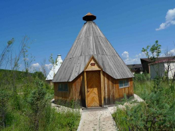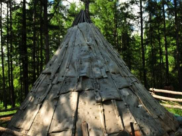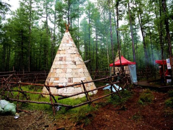撮羅子的選址,是在地勢(shì)較高、陽(yáng)光能照射到而且水和柴草就近可取的平坦之處。其蓋造方法,是用三五根約碗口粗細(xì)上有枝杈的木桿,相互交合搭成上聚下開(kāi)的骨架,然后再用30根左右木桿搭在骨架之間捆綁固定,在南面(或東面)留出門(mén),即基本成型。木桿搭起的只是“屋架”,外面還要覆蓋才能遮風(fēng)擋雨。按照季節(jié)的不同,分別用樺樹(shù)皮、草簾子和犴、狍等獸皮,做成自上而下一層壓一層的圍子,綁在木桿上,門(mén)簾則夏用草或樹(shù)條編,冬用狍皮做成。