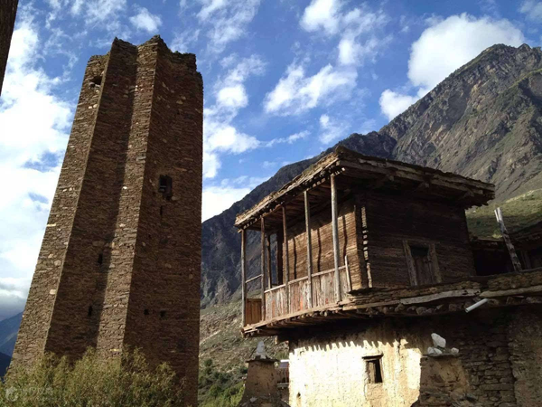 在羌語(yǔ)中,碉樓被稱為“邛籠”,意為美麗、高貴的房子,早在2000年前《后漢書·西南夷傳》就有羌族人“依山居止,壘石為屋,高者至十余丈”的記載。碉樓的高度在十米至三十米之間,用于御敵、貯存糧食和柴草。碉樓有四角、六角、八角幾形式,有的高達(dá)十三四層。建筑材料是石片和黃泥土,墻基深1.35米,以石片砌成。石墻內(nèi)側(cè)與地面垂直,外側(cè)由下而上向內(nèi)稍傾斜。修建時(shí)不繪圖、吊線、柱架支撐,全憑高超的技藝與經(jīng)驗(yàn)。建筑穩(wěn)固牢靠,經(jīng)久不衰。自唐朝來(lái),羌族人民因各種原因向西北遷移,到了西藏和青海,所以現(xiàn)在,羌族碉樓也往往被稱為藏族碉樓。