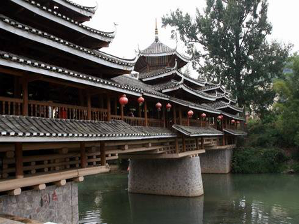 瑤族風(fēng)雨橋,又被稱之為“涼橋”或“風(fēng)水橋”。除木橋外,大多是在石拱橋上加蓋橋廊、橋亭和在橋頭的橋臺上建閣樓,穿斗式木構(gòu)架,二層檐或三層檐,有的四層檐,通高在9米~10米間。風(fēng)雨橋不僅是路人避雨之處,也是瑤族男女青年談情說愛的約會場所。廣西瑤族風(fēng)雨橋主要集中在富川瑤族自治縣和恭城瑤族自治縣。富川縣保存至今的古代瑤族風(fēng)雨橋有18座,其中著名的有迥瀾橋(建于明萬歷年間),青龍橋(與前者同時期修建),以及福壽橋、高橋、鳳溪新橋、皇侯泉橋、東轅橋、鸕鶿塘瀾通橋、龍歸橋、興隆橋等。