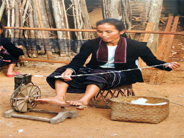 “紡”是把野生棉花或木棉花用絞棉機(jī)去除棉籽后捻成線,纏繞到手捻紡輪車上,包括錯紗、配色、綜線、攀花等。