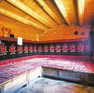聚居新疆維吾爾自治區(qū)昌吉回族自治州奇臺縣大黑溝村農(nóng)牧區(qū)的塔塔爾族有兩種住房。一種是厚木板做墻壁的木刻楞房,另一種是平頂土房。木刻楞房建在平整的土臺上,房前設(shè)立木柱成廊道,只在前面設(shè)玻璃窗。板壁直角切半榫頭相搭,涂紅油漆。棚頂以粗大木檁密搭于板壁上,形成緩斜坡,不用椽子,直接以木板蓋頂。室內(nèi)彌漫著淡淡的松香味,以木板搭炕,中間立一細木柱,板炕上鋪花氈,被褥疊在墻角,墻邊立幾個靠墊,使坐靠更舒適。進門正廳隔出的一小間,是方便老人起居生活的臥室。