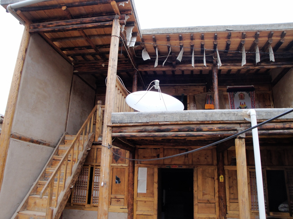 為改善狹小的寨內(nèi)空間,當(dāng)?shù)鼐用窬藿硕幽窘Y(jié)構(gòu)樓房,和青海鄉(xiāng)村民居庭院寬敞的特點(diǎn)形成了反差。寨內(nèi)民居庭院多為四合院式,房屋為土木結(jié)構(gòu)平頂房,一般民居都有飛椽花藻之類(lèi)。屋內(nèi)一般以木板作隔扇,室內(nèi)有護(hù)炕木板、護(hù)墻木板墻圍,且多雕花草于其上。房屋一般面闊三間,正面以木板隔墻并裝上木板條方格小花窗。佛堂設(shè)在二樓,佛堂所在的房屋一般都是上房,和佛堂不同向的兩邊廂房一般做臥室。院落中央一般都有豎掛經(jīng)幡的旗桿,還設(shè)有桑臺(tái),具有明顯的藏式特點(diǎn)。