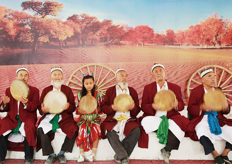 從麥迪娜9歲起教她達(dá)甫手鼓的是母親,把她打扮得漂漂亮亮的、去趕一場(chǎng)又一場(chǎng)麥西來甫的也是母親。作為央塔克鄉(xiāng)文化站站長,麥迪娜的母親整年都忙碌得要死。麥蓋提縣央塔克鄉(xiāng)以刀郎舞、農(nóng)民畫立鄉(xiāng),觀光者多,活動(dòng)多,任務(wù)多,接待多。它不僅是旅游之地,也是生活之地。麥迪娜的母親是位典型的維吾爾族女性,眉眼如刻,目光流轉(zhuǎn),婚后迅速發(fā)胖。在一大群女人當(dāng)中,她一定是最搶眼、最熱烈、最能干的那個(gè)。無論哪家舉行麥西來甫,都會(huì)邀請(qǐng)她。她總是提前到來,手腳麻利地幫忙,氣度昂揚(yáng)地端桌布菜,熱情洋溢地放歌起舞。有時(shí),母親也會(huì)提前帶麥迪娜到舉辦麥西來甫的家庭中,麥迪娜就會(huì)學(xué)母親的樣子,進(jìn)廚房幫忙干活,直到麥西來甫開始,才換上衣裙,擠身樂師中間。麥迪娜沒有時(shí)間像其他孩子那樣,在鄉(xiāng)野、麥西來甫上盡情嬉戲,正如她的母親,只能將女兒的日常生活托付給奶奶照顧。