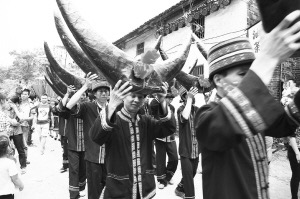 據(jù)悉,有300多年歷史的楊溪古村現(xiàn)居住著200余戶共900余名村民,該村保存完整的嶺南特色古民居有28座200余間,是恭城縣境內(nèi)保存較為完好的古建筑群之一。圖為祭牛王大典活動(dòng)現(xiàn)場。