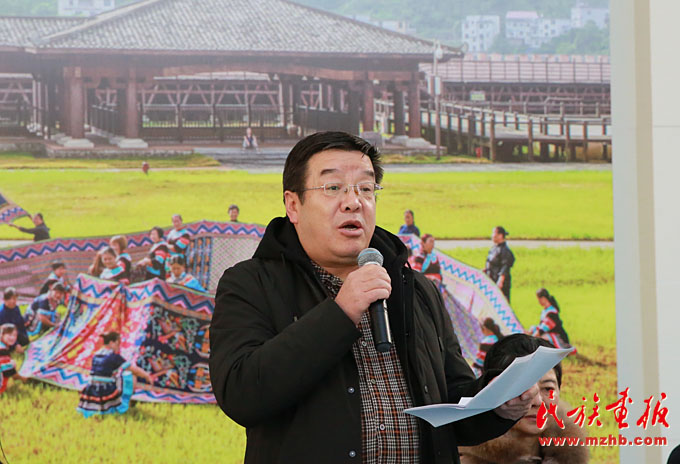 會上中國民族博物館黨委副書記、副館長張志文向少數(shù)民族作家們介紹了展覽,他說:“土家族是一個歷史悠久的民族,現(xiàn)在有835萬人口。土家織錦也有兩千多年的發(fā)展歷史,有250多種傳統(tǒng)圖案,是中國民間五大織錦之一,堪稱中國服飾文化中的奇葩。中國民族博物館從歷年征集收藏的300多幅清代以來的土家織錦中,選取了156幅精品土家織錦、21分鐘傳承人視頻和120余幅土家民族風情照片。我們和中國婦女兒童博物館合作舉辦了這個高品質的專題展,旨在傳承和弘揚土家族國家級非物質文化遺產?!?/p>