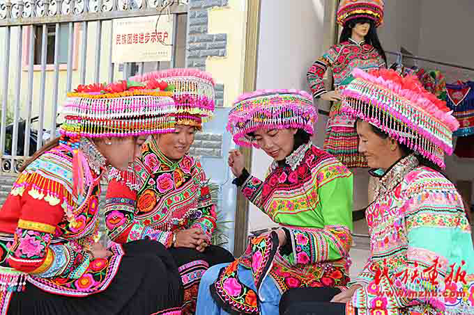 搬遷到傈園新村后,安學(xué)芬(左二)和妹妹安學(xué)珍在政府的扶持下辦起了刺繡手工坊,為了提高繡品質(zhì)量,他們經(jīng)常與同村婦女進行刺繡手藝交流