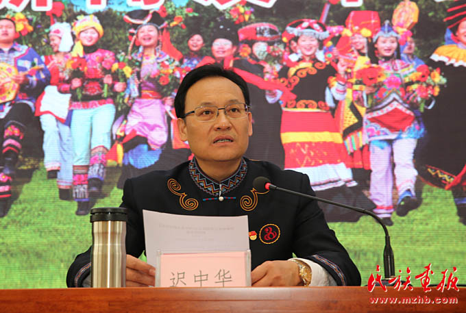 楚雄州委副書記、楚雄州人民政府州長遲中華介紹楚雄彝族自治州基本情況和自治州成立六十年來經(jīng)濟社會發(fā)展的輝煌成就等情況