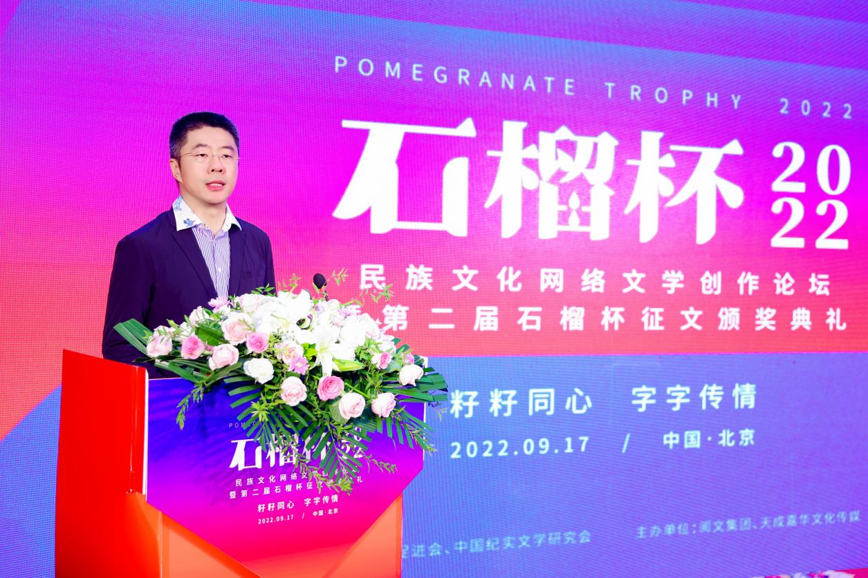 2022年9月17日,民族文化網(wǎng)絡(luò)文學(xué)創(chuàng)作論壇暨第二屆石榴杯征文頒獎(jiǎng)活動(dòng)在民族文化宮舉行。本次活動(dòng)得到了國(guó)家民委所屬中國(guó)少數(shù)民族文化藝術(shù)促進(jìn)會(huì)和中國(guó)紀(jì)實(shí)文學(xué)研究會(huì)的指導(dǎo)與支持,由閱文集團(tuán)、北京天成嘉華文化傳媒主辦,天成達(dá)星國(guó)際傳媒承辦。