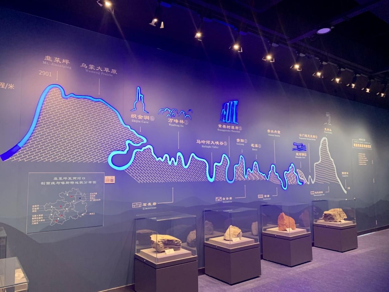 “多彩貴州”展廳以“喀斯特王國(guó)”為主題,分為“滄海變遷”“追根溯源”“經(jīng)典地貌”“地質(zhì)旅游”四個(gè)部分,運(yùn)用聲光電、場(chǎng)景復(fù)原、油畫(huà)、沙盤(pán)等展示手段,再現(xiàn)貴州“喀斯特王國(guó)”的各類地質(zhì)景觀,大自然的鬼斧神工。