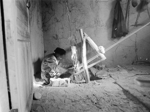 老人休息了一會兒,再次回到紡織機上。我近距離觀察紡線車的使用方法,雙手來回傳遞梭子織出經線,雙腳控制3個提綜開口裝置上下運動。經過來回反復地動作,駝絨布一寸一寸地織出來了。