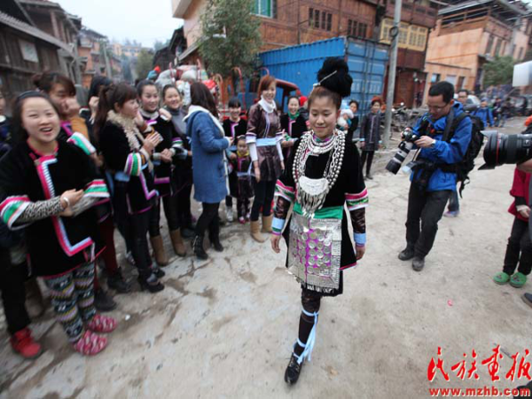 新娘走秀和鬼師做法是婚禮儀式的一項主要內容。新娘走秀在第一天上午九時舉行,這是新娘唯一向眾人展示自己的機會也是婚禮中最為隆重的儀式,這時街心廣場及道路兩側擠滿了看熱鬧的群眾。之前新娘們都要精心打扮一番,穿上嶄新漂亮的傳統(tǒng)衣裙,戴上各種銀飾,然后在親人的目送下離開家門。新娘走秀與漢族結婚的迎親有很大不同,沒有新郎伴娘的陪伴,更沒有車水馬龍的迎親隊伍,只是一人獨身前行。鬼師做法在新娘登場后進行,我們只是見到了鬼師做法后留下的一些物品。