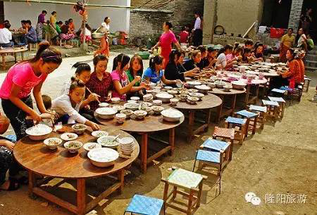 男方家也得請(qǐng)客。新郎啟程去接新娘子,家里馬上就殺雞做飯,新郎新娘回來(lái)后要吃染成黃色的糯米飯和雞肉,表示往后生活美滿幸福,像糯米飯一樣結(jié)成團(tuán)永不分開(kāi)。晌午時(shí)分,是新郎家待客最熱鬧的時(shí)候,幫廚的人擺上各種酒菜,親朋寨鄰老老少少全坐到天井里,歡歡鬧鬧地吃飯。最后,客人們有的陸續(xù)走了,愿留下的湊攏幾桌,邊喝酒邊暢談,一直要吃到第二日還不歇。
