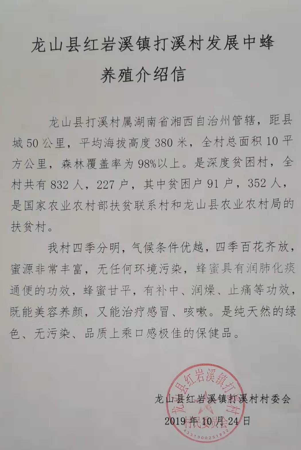 這里四季分明,氣候條件優(yōu)越,四季百花齊放,蜜源非常豐富,無任何環(huán)境污染。據(jù)湖南省湘西州龍山縣紅巖溪打溪村支部書記沈世平介紹:“我們這兒已經(jīng)有很長(zhǎng)的養(yǎng)殖蜜蜂的歷史,環(huán)境無污染,田土少,屬于純天然養(yǎng)殖,無農(nóng)藥,利于中蜂的養(yǎng)殖,并且在2019年4月份的時(shí)候,通過農(nóng)業(yè)部及農(nóng)業(yè)科學(xué)院的專家實(shí)地考察,認(rèn)證為最佳養(yǎng)蜂環(huán)境。今年獲得鄉(xiāng)政府幫扶,規(guī)劃從龍山縣中心養(yǎng)殖合作社引進(jìn)50箱進(jìn)行集中養(yǎng)殖,明年開始分設(shè)4點(diǎn),一個(gè)點(diǎn)150箱,擴(kuò)大產(chǎn)量,并向全縣推廣?!?/p>