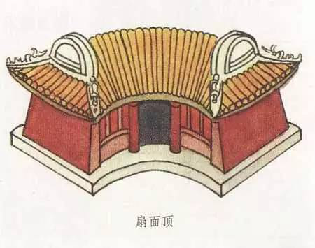 扇面頂和萬字頂一樣,是一種非常別致的屋頂形式,扇面頂顧名思義,就是扇面形狀的屋頂形式,其最大特點就是前后檐線呈弧形,弧線一般是前短后長,即建筑的后檐大于前檐。建筑的西山墻的墻線若向內延伸,可以交于一點,而這一點就是扇形的扇子柄端。扇面頂?shù)膬啥丝梢宰龀尚健疑?,也可做成卷棚形式。扇面頂一般都用在形體較小的建筑中,會讓建筑看起來更為小巧可愛。