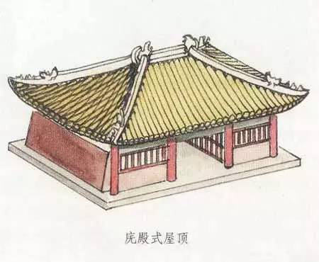 根據(jù)資料與記載,廡殿頂屋頂早在殷商時代就已出現(xiàn)。不過,現(xiàn)在對唐代中期以前的廡殿式屋頂?shù)木唧w結構已無從得知,晚唐以后漸有實例可查。其形象是屋面平緩,正脊較短。正脊兩端為鴟尾而不是鴟首。