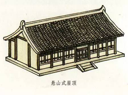 懸山式屋頂與硬山式屋頂一樣有一條正脊和四條垂脊。不過,它又有不同于硬山式屋頂那樣與山墻平齊,而是伸出山墻之外。這部分伸出山墻之外的屋頂是由下面伸出的桁(檁)承托的。所以懸山式屋頂不僅有前后出檐,在兩側山墻上也有出檐。懸山式是兩面坡屋頂?shù)脑缙谧龇?,不過中國古代的重要建筑基本沒有使用懸山式屋頂?shù)?,特別是唐代以前尤為少見。