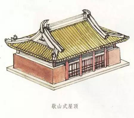 歇山是清式叫法,在清代之前它又有曹殿、漢殿、廈兩頭造等不同名稱。歇山式屋頂在具體形式上又有最基本形式的單檐歇山頂,以及變化形式的二層、三層或多層屋頂?shù)闹亻苄巾敚€有最上面的屋頂可以不設正脊而形成卷棚式的卷棚式歇山頂?shù)榷喾N形式。