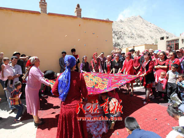 不一會兒,外面熱鬧聲一片。原來是迎親隊伍來了!只見新郎用一塊紅布遮住了臉,在眾人的簇?fù)硐?,緩慢前行。新郎的左右站了三位伴郎,他們一邊走,一邊唱起柯爾克孜族最具代表性的民間口頭文學(xué)“約隆歌”。每走幾步,新郎都會伴著歌聲的旋律和手勢鞠一下躬。新郎和伴郎腰間各系有一塊紅布,他們邊走,后面幾個新娘家的姐妹就要不時抓住他們腰間的紅布,往后拉一下,盡量不讓他們走得太快。其原因是希望他們多唱歌、多鞠躬,以表達(dá)對女方的尊重。