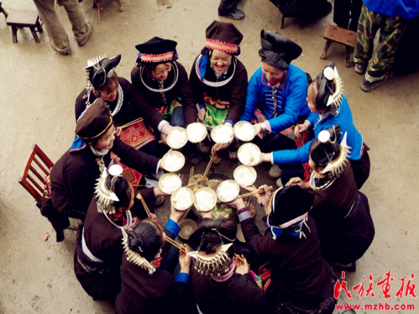 敬酒過后,新娘走上吊腳樓進入洞房休息片刻,然后與新郎一同在樓上向前來賀喜的親友拋灑喜糖。來賓蜂擁而上爭搶喜糖,一片歡騰場面。分完喜糖,新娘來到吊腳樓前的院子里用早已準備好的清水親手為婆婆擦臉,表示新媳婦對長輩的尊敬與孝心。