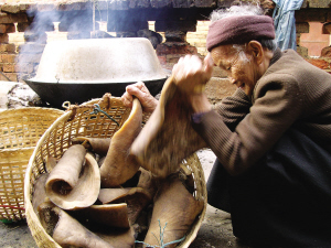 據(jù)曼滿村的傣族老人介紹,制作泡牛皮的材料是水牛皮,黃牛皮太薄是不行的。水牛皮買回家后,第一道工序是去毛。將牛皮用沸水燙后,刮盡上面的牛毛,剔掉附著的筋肉,再將牛皮煮至用竹筷稍用力可穿透為止。第二道工序是晾涼,刮去牛皮的上下兩層,將中間一層純皮切成長(zhǎng)10厘米、寬1至2厘米的條狀,然后,將其曬成干品,放進(jìn)60℃左右的油鍋內(nèi)浸泡24小時(shí),撈出,濾油曬干,供油炸用。要吃的時(shí)候,把曬干的條狀牛皮放入熱油鍋中,文火加熱,直至牛皮像油條一樣發(fā)泡、微黃時(shí),取出食用即可。
