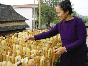 油炸牛皮,傣話叫“喃膀”,是傣家人的一項(xiàng)傳統(tǒng)美食。嘎灑鎮(zhèn)曼滿村是有名的泡牛皮制作村,村里的傣族老人專門生產(chǎn)泡牛皮,而曼灑村傣族老人專門銷售泡牛皮,已經(jīng)形成了一條比較默契的產(chǎn)業(yè)鏈。