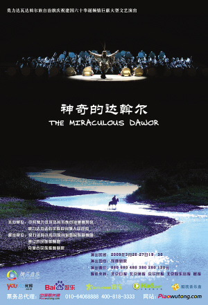 作為內(nèi)蒙古自治區(qū)莫力達(dá)瓦達(dá)斡爾族自治旗(以下簡(jiǎn)稱(chēng)“莫旗”)慶祝建國(guó)60周年的活動(dòng)之一,2009年3月26日至27日,北京保利劇院迎來(lái)了一場(chǎng)名為《穿越千年——神奇的達(dá)斡爾》(以下簡(jiǎn)稱(chēng)“《神奇的達(dá)斡爾》”)的大型文藝演出。這臺(tái)主要由烏蘭牧騎傾情奉現(xiàn)的演出分《亙古風(fēng)云》、《山魂水魄》、《日月同歌》、《天地祥和》、《陽(yáng)光燦爛映山紅》5部分,分別展現(xiàn)達(dá)斡爾族在歷史、文化、藝術(shù)、體育等多方面的成就和風(fēng)情,可謂一場(chǎng)立體的非物質(zhì)文化遺產(chǎn)展覽。