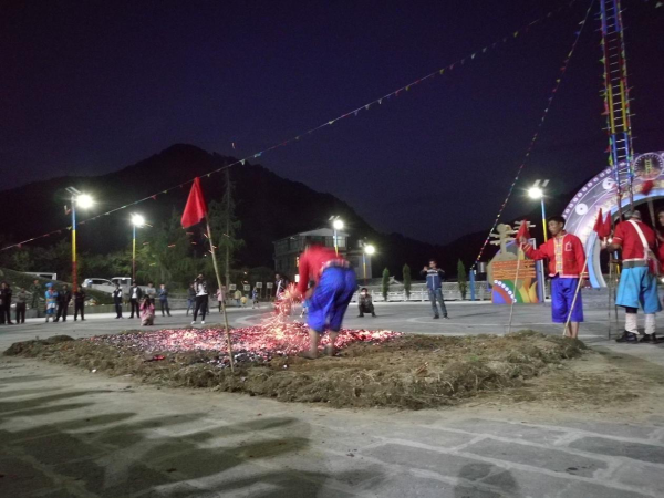 上刀山、下火海,是傈僳族民間的傳統(tǒng)民俗活動(dòng),是其傳統(tǒng)節(jié)日“刀桿節(jié)”上的主要表演項(xiàng)目。傈僳族的“刀桿節(jié)”源于一種原始的宗教活動(dòng)。早期在“刀桿節(jié)”上表演上刀山、下火海的勇士們,都得聽(tīng)命于巫師。上刀山、下火海之前,有一套繁瑣的宗教祭祀儀式。而且每個(gè)上刀山、下火海的勇士身上都要掛上幾十條巫師畫的符咒,使這一活動(dòng)蒙上了濃厚的宗教色彩。經(jīng)過(guò)改革的傈僳族的“刀桿節(jié)”,一般于每年二月初八舉行,屆時(shí),上刀山、下火海就是表演的重要內(nèi)容。上刀山之前,人們首先豎起兩根20 多米長(zhǎng)的筆直的松樹(shù)桿。在樹(shù)桿之間順序捆上36 或72 把鋒利的刀刃向上的鋼刀作梯子。表演開(kāi)始后,表演者赤手光腳,蹬上梯子頂端,并要做些“蜻蜓倒立”“飛燕迎春”等高難動(dòng)作。下了刀桿后,勇士們還要赤裸著上身、光著腳跳入熊熊烈火中,甚至用身體滾壓火海,直至炭火逐漸熄滅為止。此后,群眾性的娛樂(lè)活動(dòng)就開(kāi)始了,唱歌跳舞,呈現(xiàn)出節(jié)日的歡樂(lè)氣氛。上刀山、下火海,是經(jīng)過(guò)表演者長(zhǎng)期的武術(shù)和氣功訓(xùn)練才能完成的。這一活動(dòng)也表現(xiàn)出傈僳族人民機(jī)智、勇敢、知難而進(jìn)的優(yōu)良品質(zhì)。