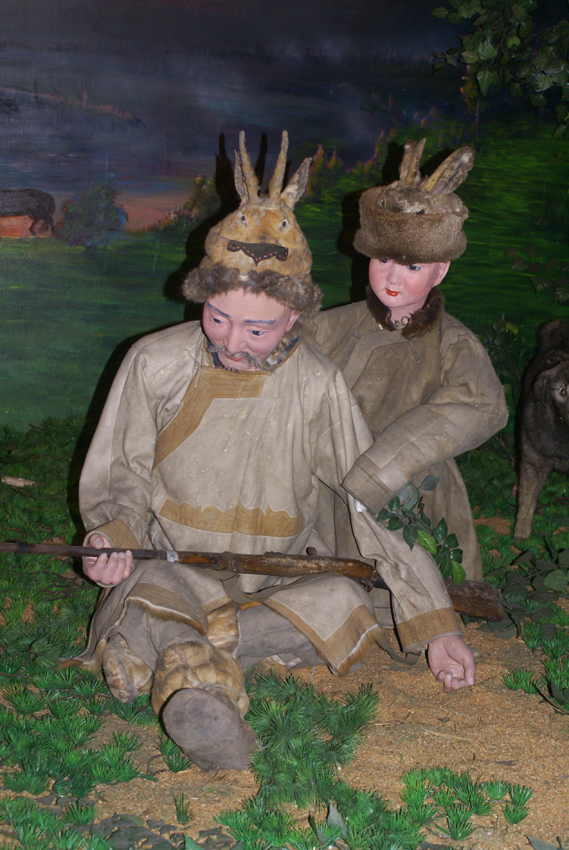 狩獵經(jīng)濟(jì)在鄂倫春族社會(huì)中維持了幾千年,一人一匹獵馬一桿槍,再加上幾條獵狗和一片獵場(chǎng),幾乎就是鄂倫春族的全部生產(chǎn)力。而槍支的傳入也不過(guò)才300多年的歷史,在此之前使用石塊和木棒狩獵,后來(lái)發(fā)明了扎槍和弓箭,與外界幾乎隔絕,純粹的食獸肉、衣獸皮。鄂倫春族最早使用的獵槍是被稱做“俄羅斯鳥(niǎo)槍”的火槍,這是清朝的察邊官吏、外民族及俄國(guó)商人交換給他們的。有火繩槍、火鐮槍和泡子槍三種,都是從槍筒裝入火藥或鉛彈,只是引爆方式不同。民國(guó)以后陸續(xù)傳入俄國(guó)造的連珠式和“三八”式、“七九”式等現(xiàn)代步槍。槍支的傳入,使鄂倫春人有了剩余產(chǎn)品,于是出現(xiàn)了交換經(jīng)濟(jì)。每年五月的“楚勒罕”集會(huì)時(shí),鄂倫春、鄂溫克、達(dá)斡爾等狩獵民族要向清廷貢貂,經(jīng)朝廷官員檢驗(yàn),不合格者可以在集會(huì)上進(jìn)行互市。此時(shí),他們也帶一些其他的獵產(chǎn)品及手工藝品進(jìn)行交換。由于鄂倫春人所貢貂皮質(zhì)量最好,故朝廷對(duì)他們采取了特別的納貂辦法:每年派一名專職人員到鄂倫春地區(qū)代表官府征收貂皮、發(fā)放賞賜。這些專職人員被稱為“諳達(dá)”,他們代表官府征收貂皮的同時(shí),也自帶一些糧食、布匹和其他生產(chǎn)、生活用品與鄂倫春人進(jìn)行私下交換。后來(lái),“諳達(dá)”變成了泛指進(jìn)山進(jìn)行獵產(chǎn)品收購(gòu)生意的所有商人。“諳達(dá)”與鄂倫春人進(jìn)行交換時(shí)從不計(jì)價(jià),而是以“馬馱”為計(jì)量單位,雙方以同樣一馬馱的物品進(jìn)行互換,或者采取包干制的辦法,一個(gè)“諳達(dá)”固定幾個(gè)包攬戶,按期供給他們生產(chǎn)和生活必需品,包攬戶將所有的剩余產(chǎn)品交于“諳達(dá)”。隨著貨幣經(jīng)濟(jì)的發(fā)展,清末時(shí)期,鄂倫春族周邊地區(qū)出現(xiàn)了眾多商號(hào)商鋪,這些商號(hào)(鋪)的老板被稱為“老客”,他們同鄂倫春人進(jìn)行計(jì)價(jià)交換。同時(shí)還出現(xiàn)了一些進(jìn)行計(jì)價(jià)交換的行商,被稱為“跑老客”。鄂倫春人雖然受到“諳達(dá)”、老客和跑老客的瘋狂欺詐和層層盤剝,但在與他們的交換中,卻自覺(jué)或不自覺(jué)地打開(kāi)了封閉的自然經(jīng)濟(jì)大門,朝著商品經(jīng)濟(jì)邁進(jìn)了一步(鄂倫春博物館展覽攝影:劉軍)。