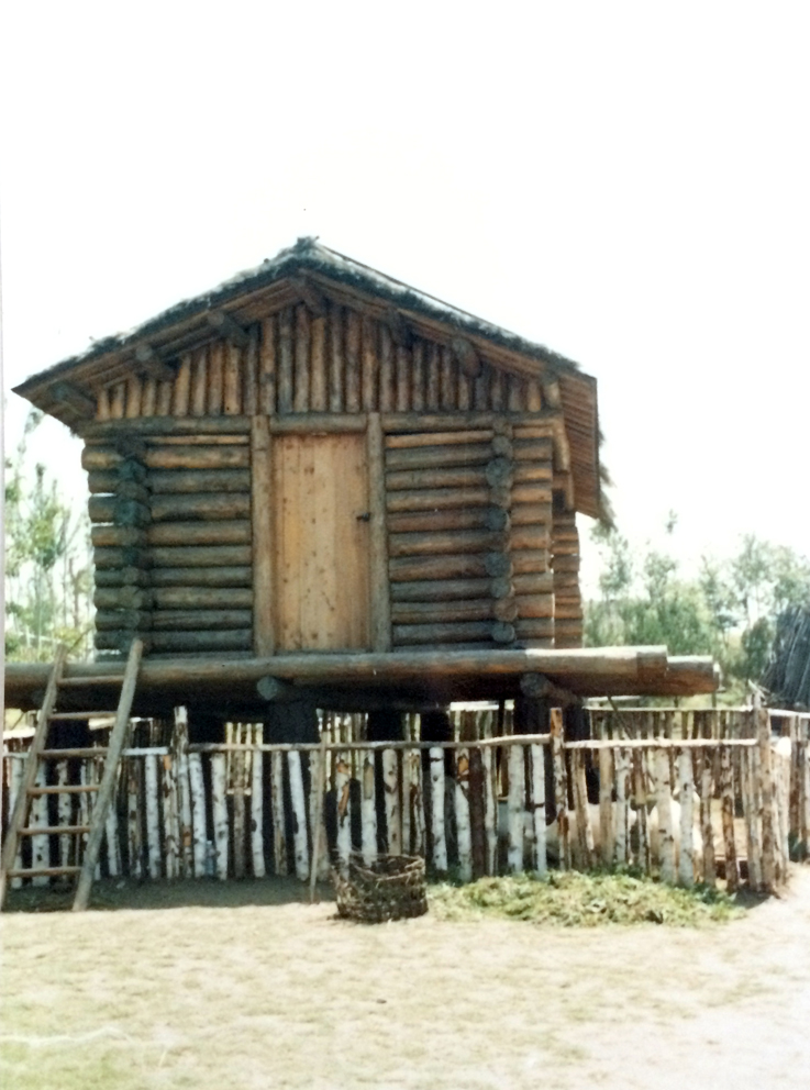 早期,每一個(gè)家族公社都有一個(gè)公用的高腳倉(cāng)庫(kù),鄂倫春語(yǔ)叫“歐倫”,一般是在游獵的中心地帶,選擇四棵自然生長(zhǎng)、成對(duì)角的樹(shù),在距地面約3—4米高的地方留一個(gè)樹(shù)杈,砍掉其余的樹(shù)頭,樹(shù)杈上架兩根直樹(shù)干,樹(shù)干上面一根挨一根地平鋪木桿成為底座,底座上用木桿壘一個(gè)“木刻楞”小房或用樹(shù)枝做一個(gè)半圓形的架子,覆蓋樺樹(shù)皮,然后用藤條或樹(shù)皮綁縛固定。一側(cè)留有進(jìn)出的小門(mén),借助木梯上下,為防止野獸攀上糟蹋東西,平時(shí)都把木梯放倒在一邊。這種倉(cāng)庫(kù)主要存放一些暫時(shí)吃不了和用不著的食品和雜物,搬遷時(shí)不拆除,里面的東西也不帶走,什么時(shí)候需要再騎馬來(lái)取。個(gè)體小家庭獨(dú)立以后,公共庫(kù)房變成了私家財(cái)產(chǎn)。雖說(shuō)是私家財(cái)產(chǎn),卻從不留人看守,也不上鎖。獵人在外打獵,如果一時(shí)斷糧,可以不經(jīng)主人允許,隨便到任何一家的“歐倫”中拿走所需要的東西,事后向主人通告一聲即可,以后有了如數(shù)奉還,不還主人也不索要。