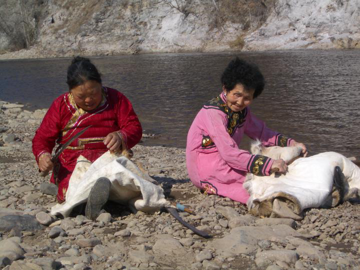 鄂倫春人過(guò)去在家庭公社“烏力鄰”里,同生產(chǎn)共消費(fèi),在當(dāng)時(shí)生產(chǎn)力十分低下的情況下,憑著扎槍和弓箭,單個(gè)人很難獲得能夠滿足衣食需要的獵物,必須要有“烏力鄰”全體成員的通力合作,才能戰(zhàn)勝兇猛和龐大的野獸,所以,在“塔坦達(dá)”領(lǐng)導(dǎo)下的集體狩獵是當(dāng)時(shí)最主要的勞動(dòng)形式。隨著生產(chǎn)力的不斷發(fā)展和個(gè)體小家庭的大量流動(dòng),不僅社會(huì)組織“烏力鄰”由原來(lái)血緣性的家庭公社演變?yōu)榈鼐壭缘牡赜蚬?,勞?dòng)組織也隨之發(fā)生了極大的變化。集體狩獵已不再是“烏力鄰”傾巢出動(dòng),而是由幾個(gè)小家庭的成員自愿結(jié)合成“安嘎”來(lái)進(jìn)行。同時(shí)還出現(xiàn)了集體和個(gè)人等多種勞動(dòng)形式。狩獵也不再單純是為了滿足衣食的需要,剩余獵物可以拿去交換,獵產(chǎn)品已趨于商品化。故此時(shí)一些珍貴的細(xì)毛皮張和藥用價(jià)值較高的獸類,成了鄂倫春人主要的狩獵目標(biāo)。這樣就形成了一年中的四個(gè)狩獵旺季,即:農(nóng)歷正月至2月是“鹿胎期”;4月至6月是“鹿茸期”;9月至落雪為“叫鹿尾期”;落雪后至來(lái)年開春是“打皮子期”。大概是源于原始的圍獵,鄂倫春人把狩獵叫“打圍”,而這四個(gè)狩獵旺季就叫“紅圍期”?!凹t圍期”除“叫鹿尾期”外,都組織“安嘎”集體出獵?!鞍哺隆笔且环N臨時(shí)性的狩獵組織,狩獵旺季將臨時(shí),由一人發(fā)起,串聯(lián)幾位親朋好友或志趣相投的人組成一個(gè)“安嘎”,待獵期結(jié)束,“安嘎”自行解散,下次出獵時(shí)再重新組合,因此其成員并不是固定的(圖為熟化狍皮,吳雅芝攝影)。