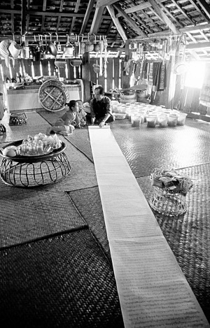 這時(shí),走來一個(gè)大佛爺和兩個(gè)老人,因?yàn)榉鹱娌粫?huì)開口說話,他們是來替佛祖給玉波念“薩拉帥”祝詞的。先由大佛爺念了一段《祝福經(jīng)》,給玉波滴了水,然后兩個(gè)老人打開玉波那寬半尺、長足有7米多的“薩拉帥”祝詞。玉金說,這祝詞是請曼降村的前大佛爺康朗寫的(康朗:指佛爺還俗的人)。來倆個(gè)老人念,是考慮到可以換著念。玉波的奶奶也想到了玉波可能跪不習(xí)慣,就帶來了墊子,讓玉波或跪或坐,因?yàn)槟钔曜T~要兩三個(gè)小時(shí)。祝詞的內(nèi)容大致是這樣的:“我是一個(gè)在菩提樹下長大的女孩,在佛祖的護(hù)蔭下,臉長得像菩提樹葉一樣又嫩又青,身材像檳榔樹一樣苗條好看,心像金鹿一樣善良。當(dāng)我年滿12歲以后,人世間的喜樂情愛,貧窮苦難就會(huì)來到我的面前。今天在父母的幫助下,我準(zhǔn)備了這些物品來賧給佛祖。我千祈禱萬祈求,希望佛祖保佑我織布是行家,丈夫種田是能手。命里見火能親,遇水能溶。生的孩子女的長得像一只蜜蜂,男的長得像一頭水牛,用他們的勤勞贍養(yǎng)雙親。從小就聽話,自幼就很乖。在母親的懷里不亂哭,在父親的背上不亂搓……”