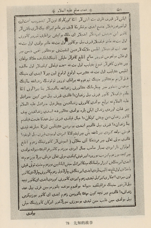 察合臺(tái)文著作。1899年喀山大學(xué)鉛印本。高25.5厘米,寬17.5厘米,共510頁(yè)。作者拉布古孜,寫(xiě)于14世紀(jì)。圖為《先知薩立哈故事》中的一頁(yè)。寫(xiě)的是異教徒們?cè)谀Ч淼闹瓜聦⒁蔀橄戎_立哈的父親卡斯瓦爾關(guān)進(jìn)地牢,天使奉真主之命使他逃出后與妻子見(jiàn)面的故事?,F(xiàn)藏新疆博物館。該書(shū)語(yǔ)言豐富生動(dòng),屬哈喀尼耶語(yǔ)(后期回鶻語(yǔ))和察合臺(tái)語(yǔ)之間的過(guò)渡語(yǔ)言,一定程度上反映了當(dāng)時(shí)的口語(yǔ),是研究維吾爾語(yǔ)言史和文學(xué)史的重要資料。