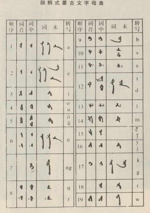 回鶻式蒙古文是一種拼音文字,字母分表示元音和表示輔音的兩大類。書寫時元音字母和輔音字母結(jié)合得很緊,筆畫連在一起,一氣呵成。最小的書寫單位是詞。但早期拼寫法不甚嚴(yán)密,有一個詞分做兩段書寫的情況。書寫格式是從上往下豎寫,從左往右移行。回鶻式蒙古文字母在詞首、詞中、詞末等不同位置上筆畫略有變化,以適應(yīng)連寫的需要。