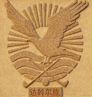 獵鷹是達斡爾族人民的吉祥物,這與達斡爾族先民曾以狩獵作為主要生產(chǎn)活動方式有關(guān)。在以弓箭為主要工具的狩獵年代,獵鷹是達斡爾族人狩獵的得力助手。獵人騎著駿馬,用手臂托舉著獵鷹,尋游于荒野山林之中。如果發(fā)現(xiàn)野雞、野兔等飛禽和小型動物,便令獵鷹迅速出擊。獵鷹從高空俯沖而下,能非常準確有效地捕獲獵物。達斡爾人自古以來善于馴養(yǎng)獵鷹,擁有一只聰明伶俐、敏捷強悍的獵鷹成為獵人的驕傲。達斡爾人崇拜獵鷹,視獵鷹為忠貞、崇高、堅強的象征,因此教育后代要象雄鷹一樣目光明敏銳,勇敢頑強,不怕流血犧牲,戰(zhàn)勝前進道路上的一切困難。