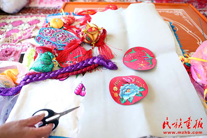 走進(jìn)她的家中,只見不大的房間中擺滿了荷包、繡花鞋墊、枕頭等刺繡品。桌上五顏六色的彩線旁,馬阿英社和兒媳婦正聚精會(huì)神地依著設(shè)計(jì)好的圖案“飛針走線”。