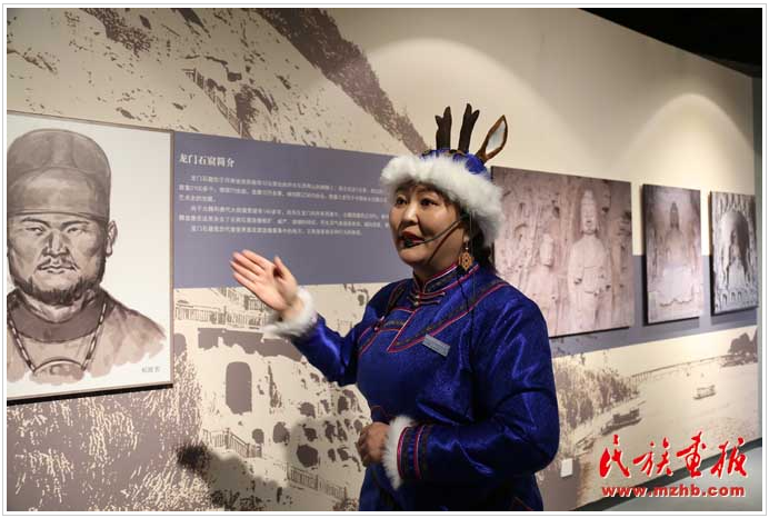 鄂倫春族講解員在拓跋鮮卑歷史博物館講解拓跋鮮卑歷史的足跡