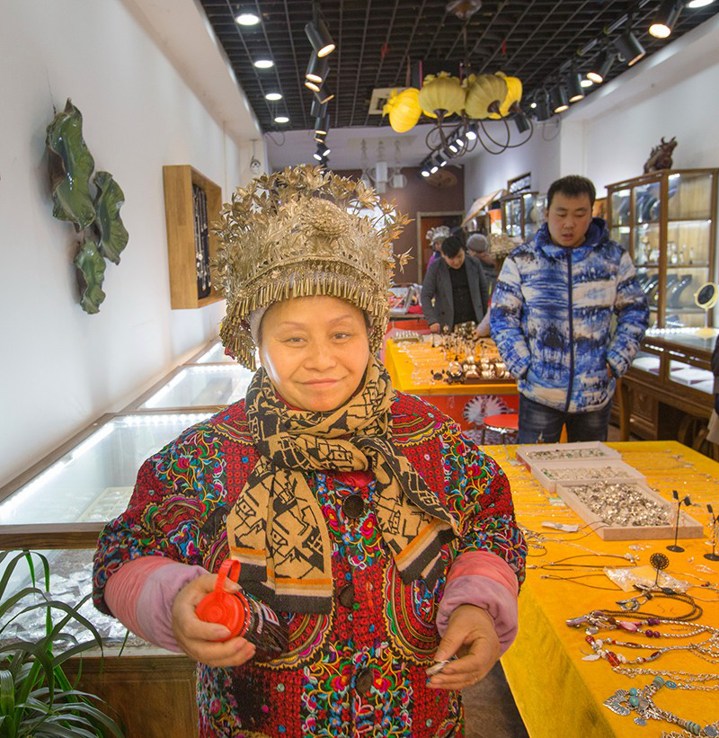 “苗奶奶”楊玉芬,苗族,今年54歲,貴州凱里人,玉芬民族工藝品有限公司總經(jīng)理,第一個在西安回民街做銀飾生意的南方人。當有人問她貴州和西安哪個更好時,她總是用一句話來打發(fā):“都好,我就是像(西安)本地人啊?!?/p>