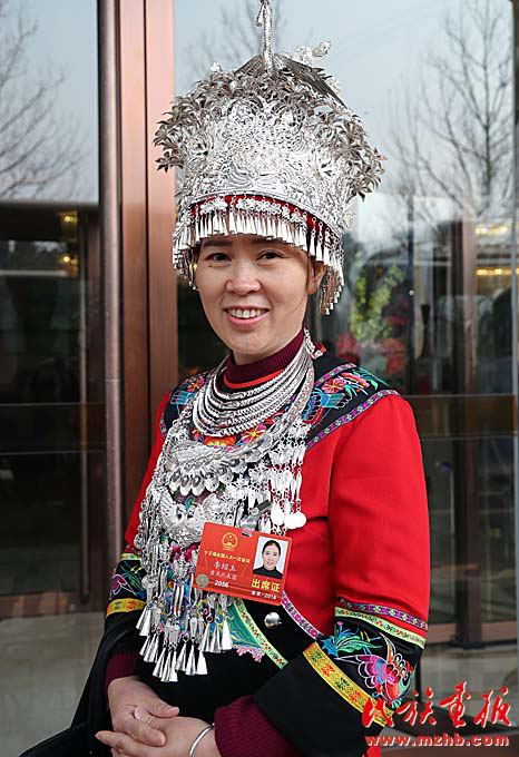 “頭頂高高的銀飾,脖子上一圈圈精美的項(xiàng)圈,走起路來叮當(dāng)作響,來自重慶市彭水苗族土家族自治縣的全國(guó)人大代表李紹玉(苗族)的這一身穿戴,一出現(xiàn)就很抓人眼球。再細(xì)看,這一身大紅的苗族傳統(tǒng)衣裝上,胸前、袖口還有繁復(fù)精致的刺繡。